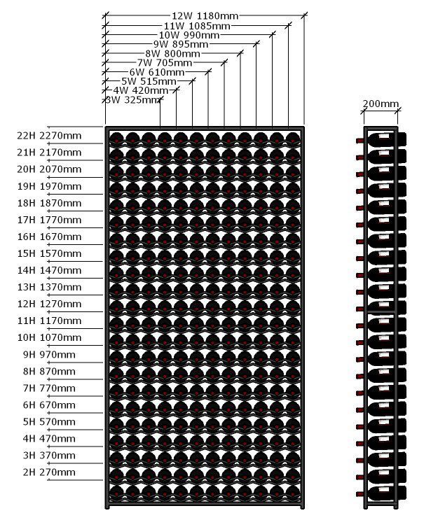 The Wave wine rack is constructed of 8mm steel rod welding in a 20x20mm steel frame and finsihed in a high quality powder coat. With the “W” design, each bottle is held more securely and by default, positioned centrally. This is important particularly with low shoulder bottles. It also results in the cellar having a more tidy appearance.